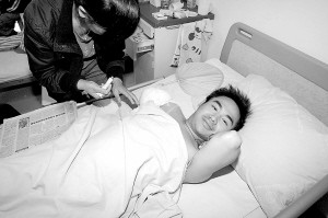 (此文发表于2008年5月) 虽然右臂截肢,薛枭依然微笑着面对一切 陈蒙川 摄 讲述者:薛枭 绵竹市汉旺镇东汽中学高二学生 17岁 被困废墟80个小时,被救出来后的第一句话是:“叔叔,我要喝可乐,要冰冻的。”这一句话,让薛枭被喻为“逗乐了悲伤的中国”的人。昨日,躺在川大华西医院骨科病床上,薛枭床头柜上和病床下,摆放着很多瓶可乐,这都是记挂着他的人们送来的。他可以尽情喝可乐了,不过,他今后只能用左手喝可乐了。挣脱死神的魔爪后,他的右臂不得不被截肢…… 废墟下: 报名 一瓶水 歌声 还有手机游戏 5月12日14时08分,薛枭坐在4楼教室里上课。化学课,化学老师唐三喜(音)刚刚布置了几道习题,教室里很安静,班上45个同学都在埋头做题。快下课了,薛枭只想着要赶紧把老师留的习题做完。 突然教室剧烈地晃动起来,讲台上的唐老师最先反应过来,他大声叫着:“地震了,大家不要慌。”但大家都很慌,薛枭和几个同学赶紧往桌子下钻,几秒钟的时间,整个教室垮塌了。薛枭只感觉脚下一空心里一空,人直往下掉,轰轰几声巨响之后,四周突然变得异常安静。 这只是一瞬间的事情,薛枭被埋在一片黑暗之中,耳边传来呜咽的哭声,哭声让他的心里很慌乱。“我是龙锐(音),还有谁在?”一个声音从头顶传来,“我是李春阳”“我是肖行(音)”……十几个声音陆续响起,熟悉的声音让薛枭镇定下来,“我是薛枭!”在吼出这句话后,薛枭开始适应“新的环境”:右手被一块预制板紧压着,薛枭用左手去推那块预制板,想把右手解放出来,沉重的预制板纹丝不动;而双腿也被两块水泥板挤压住,左腿稍微松动些,薛枭用力挣脱掉左脚的鞋,将左腿从水泥板的缝隙中抽了出来,这让他稍微感觉舒适了些,他动了动右腿,除了疼痛之外,他的右腿无法动弹。最大的安慰和希望来自于头顶的一条缝隙,那里透出些微光,也让他能呼吸到外面的空气。 在最初的慌乱过后,薛枭感觉口渴,仿佛上帝创世般神奇,不但有了光和空气,水随后就传递到了薛枭的手中。这瓶水不知是哪位同学在废墟中刨出的一个塑料杯子,里面有兑好的糖水。有同学说:“每个人都只喝一小口哈,还有很多同学要喝……”当杯子传到薛枭的手上时,他只喝了一小口,杯子就空了。 头上的微光渐渐消逝,黑夜来临。为了让大家都保持着清醒的头脑,埋在废墟里的同学们开始唱歌,定下的规矩是:一个人唱两句后,下一个人接着唱。轮到薛枭时,他忘记了歌词,接不上去,乱哼了几声,黑暗的废墟里竟然响起断断续续的轻笑声。第一个晚上,薛枭没有睡觉,身边的同学也让他没有一丝害怕,他坚信自己一定可以出去。 光线再次从缝隙中透进来,同时也带来了新的希望。5月13日一早,外面的脚步声让同学们精神为之一振,十余个人在数了“1、2、3”后,一起大声呼救:“这里有人,快来救我。”救援人员发现了他们,救援正式开始了。 就在外面救援人员紧张实施救援时,废墟里面的同学们用聊天互相鼓励,说得最多的话题是出去后干什么。有人说“出去我要先喝水”,有人说我要去买喜欢的东西。这些闲聊让薛枭感觉就像是下课时分,同学们聚在一起的唠嗑,他静静地听着,没有参与,只要能出去,干什么都好。他喊了声被埋在自己上面的同学龙锐,问龙锐的手机还在不在。他伸手让龙锐将手机递给他,在废墟里,薛枭聚精会神地玩着游戏。手机上有四格电,他在消耗了一格电量后,把手机还给了龙锐。 5月13日的白天在期待中度过,薛枭不知道有没有同学被救出去,他感到困倦了。他对身边的马小凤说,“我就睡两分钟,你记得叫醒我。”马小凤不同意,她使劲喊着薛枭的名字,不让他睡,于是同学们都开始互相喊着名字,薛枭答应着,强撑着没睡。然而,在这一次报名中,有两个同学没有了回应,薛枭心里明白,他们可能永远不会再“报名”了。薛枭有些难过,但他还没有心慌,他觉得自己死不了,而就算死,还有那么多同学陪在一起。 反倒是陆续有同学被救出去后,消息层层传到薛枭的耳朵里时,薛枭心里有些发慌了:“什么时候才能轮到我呢?”一直没有饥饿感的薛枭再次感到无可遏制的口渴感,嘴唇干裂,他用舌头一遍遍舔着嘴唇,却好像连唾液都没有了。 救援中: 向遗体道歉 可乐之约 5月14日,头顶上挖出一条更大一点的缝隙后,一根管子伸进了废墟里面,那是救援人员递进来的葡萄糖水,薛枭喝了很多,其实他更想喝矿泉水或者饮料,因为这糖水实在不合他的口味。薛枭埋在最下面,又不敢动用机器,怕引起危房垮塌,救援工作一度进展缓慢。 14日晚上,薛枭没有支撑住,太累了,他睡着了。也不知睡了多久,他迷迷糊糊听见同学李春阳在大声叫喊他的名字,随后,又有一根棍子使劲捅到了他的身上,这下把薛枭捅醒了。李春阳说:“你把我吓死了,喊你半天都不说话,我以为你也不行了。”薛枭在黑暗中疲惫地笑了一下,只回了句:“我没事。” 5月15日白天,又有同学被救了出去,下午6时过,救援通道打通后,他看见马小凤很轻松地被救援人员拉了出去,薛枭听到马小凤冲着他大声喊了句:“坚持到底。”废墟里,薛枭在激动中期待自己获救的一刻。 救援人员开始接近薛枭,清理薛枭周边的杂物。由于有余震,救援人员不时退了出去,薛枭感觉不到余震,只是在救援人员再次进来时,他有点心慌地问:“叔叔,你们不会不救我了吧?” 寻找“可乐男孩”:自己签字手术 虽然右臂截肢,薛