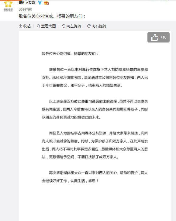 腾讯娱乐讯 12月22日,杨幂刘恺威正式官宣离婚!嘉行传媒发声明宣布杨幂刘恺威于今年签署协议,和平分手,离婚是双方彼此尊重沟通后做出的选择,未来将以亲人的身份共同照顾抚养孩子,以朋友身份真诚地祝福彼此的未来。 据悉,二人于2014年举行婚礼,同年6月诞下女儿“小糯米”,2018年12月22日宣布结束近5年的婚姻。 两人2011年因戏生情,2014年在巴厘岛举办婚礼,同年生下女儿小糯米,近期关于两人离婚的消息传得沸沸扬扬,如今终于得到证实。 12月20日下午,就有网友爆料称杨幂将于近日公布离婚,之后又有不少营销号发文暗指某85小花将于这周宣布离婚,更有大V直接转发杨幂2011年发布的微博“以为真心的付出就值得,结果依然逃不掉伤心,这就是爱情”,虽然没有直接点名,但粉丝们都猜测是在暗指杨幂离婚的传闻。 但当天下午,杨幂在三亚参加品牌活动,从现场视频来看心情相当不错,还向粉丝们提前祝贺新年,似乎并没有受到离婚传闻的影响。 而就在前一天,刘恺威的爸爸刘丹在接受采访时表示儿子刘恺威已经于近日返回香港,并会逗留一段时间:“他说想先休息一下,他一直拍剧太辛苦了。”而对于媒体一直追问儿媳妇杨幂是否会在元旦期间返回香港陪小糯米,刘丹则称自己不知道,大家工作都很忙。 《一线》此前就传闻向杨幂工作室求证,其工作人员还曾回应道:“没有,这种传闻好无聊。” 杨幂与刘恺威自2014年结婚以来一直离婚传闻不断,2015年两人还曾在微博示爱,澄清传言。 但在2016年11月,狗仔曝出刘恺威疑似出轨王鸥,也就是著名的“夜光剧本”事件,那时杨幂出席活动时还明确表示:自己无论如何都相信刘恺威。 如今,这段四年的感情划上了句号,小糯米的抚养问题以及财产分割的问题,还将继续引发网友的“强势围观”。 以下为离婚声明全文: 感谢各位一直以来对嘉行传媒旗下艺人刘恺威和杨幂的喜爱和支持。现经双方慎重考虑,决定通过本公司向各位朋友告知:两人已于今年签署协议,和平分手,结束两人的婚姻关系。 以上决定是双方彼此尊重沟通后做出的选择,虽然不再以夫妻关系共同生活,但两人今后也将以亲人的身份共同照顾抚养孩子,同时以朋友的身份真诚地祝福彼此的未来。 两位艺人为因私事占用媒体公共资源,并给大家带来纷扰,向所有人致以最诚挚的歉意。同时,为保护孩子和双方家人,在此声明发出后,两人将不再对此事做更多回应,恳请媒体和大众尊重两人的想法,更恳请给予空间,不要打扰孩子或双方家人。 再次感谢媒体和大众一直以来对两人的关心、帮助和爱护,两人会继续好好工作,认真生活,感恩! |